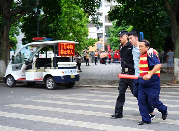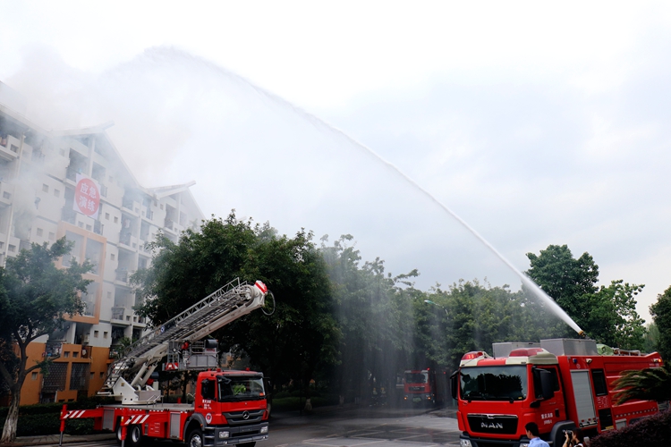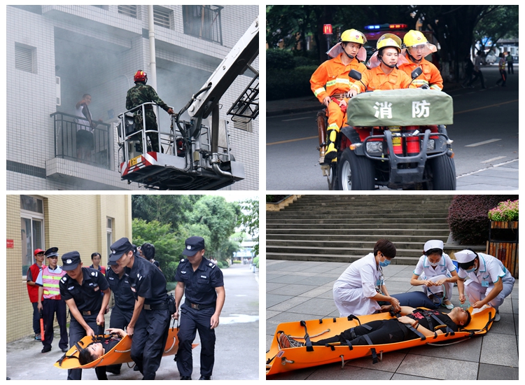 此次演练分为两部分:第一部分为地震疏散与救援。模拟发生地震,启动应急广播拉响地震警报,播报地震警告,宿舍区教师、物业管理人员、学生消防志愿者共同组织各楼学生按疏散要领从疏散通道有序疏散到指定地点,地震后学校安保队员开展搜救工作,校医务人员赶赴现场进行救援;第二部分为消防灭火与救援。模拟发生火灾场景,组织学生疏散,附近人员进行初期灭火,学校微型消防站专职消防队员、“风火战神”小组、消防巡逻车、后勤抢险车等接警立即参与现场救援,沙区消防支队高炮战车、云梯车、消防机器人运输车随后也赶到现场实施救援。经过紧张激烈的战斗,“大火”被成功扑灭,所有人员安全撤离,演练成功落下帷幕。