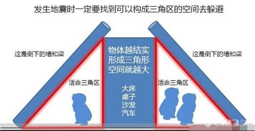 迅速寻找室内避震三角空间:室内房屋倒塌后形成的三角空间,往往是人们得以幸存的相对安全的地点,可以称其为避震空间。主要是指大块倒塌体与支撑物构成的空间,例如:结实牢固的家具附近;内墙(特别是承重墙)墙根、墙角;厨房、厕所、储藏室等开间小、有管道支撑的地方。
